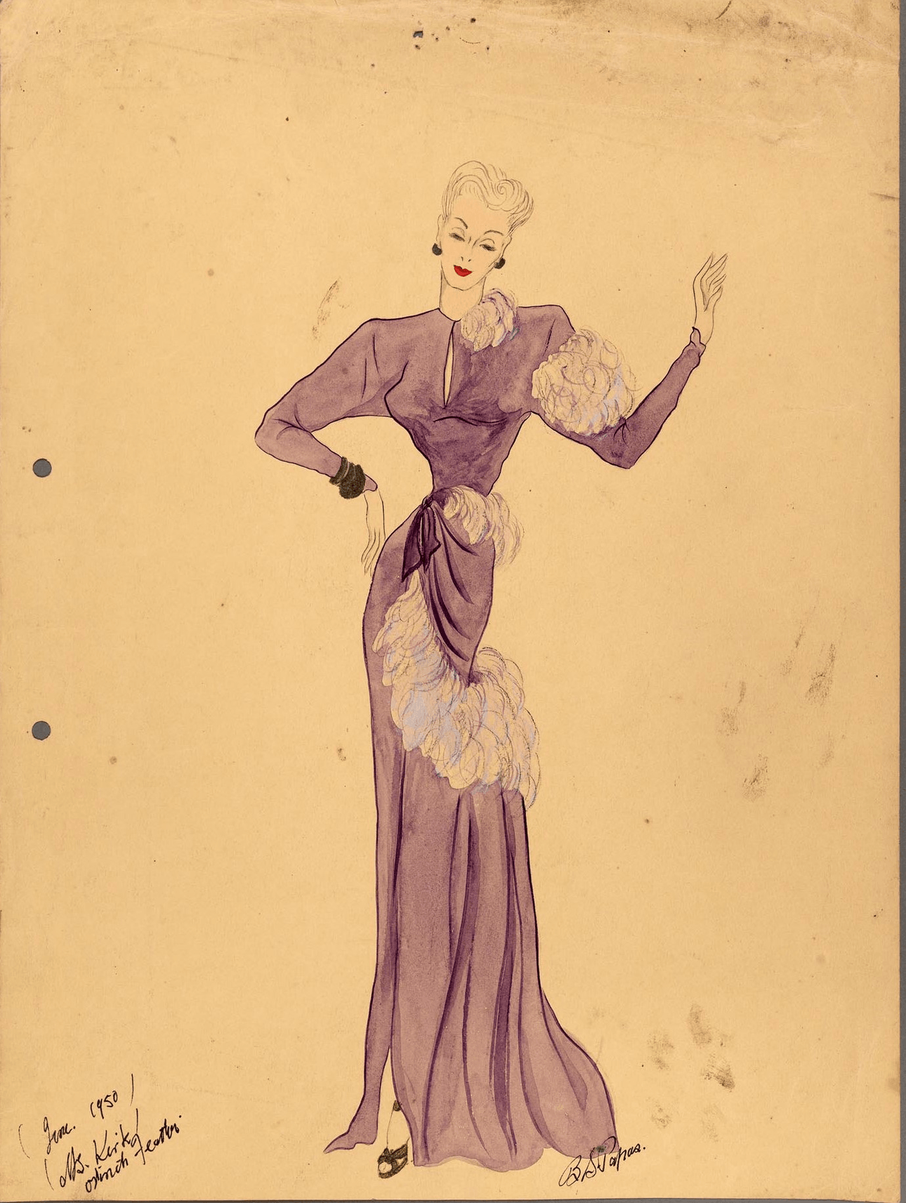 By the 1950s the country was getting back to normal; the economy was growing and so was the country’s prosperity. This new order was mirrored in people’s wardrobes as they acquired more clothes. Special occasions such as 21st birthdays and weddings were marked with lavish celebrations and elaborate dresses which meant that Bruce’s new skills were in great demand. Glamour and romance, as seen in the Hollywood movies, were our inspiration and coloured our aspirations. In Paris Christian Dior had reinvigorated the city’s reputation as the fashion capital with his ‘New Look’. This soft feminine silhouette with its narrow waist and long full skirts was in evidence everywhere and was interpreted for the New Zealand market by manufacturers and designers such as Bruce Papas, whose beautifully detailed and annotated fashion sketches are included in the exhibition.