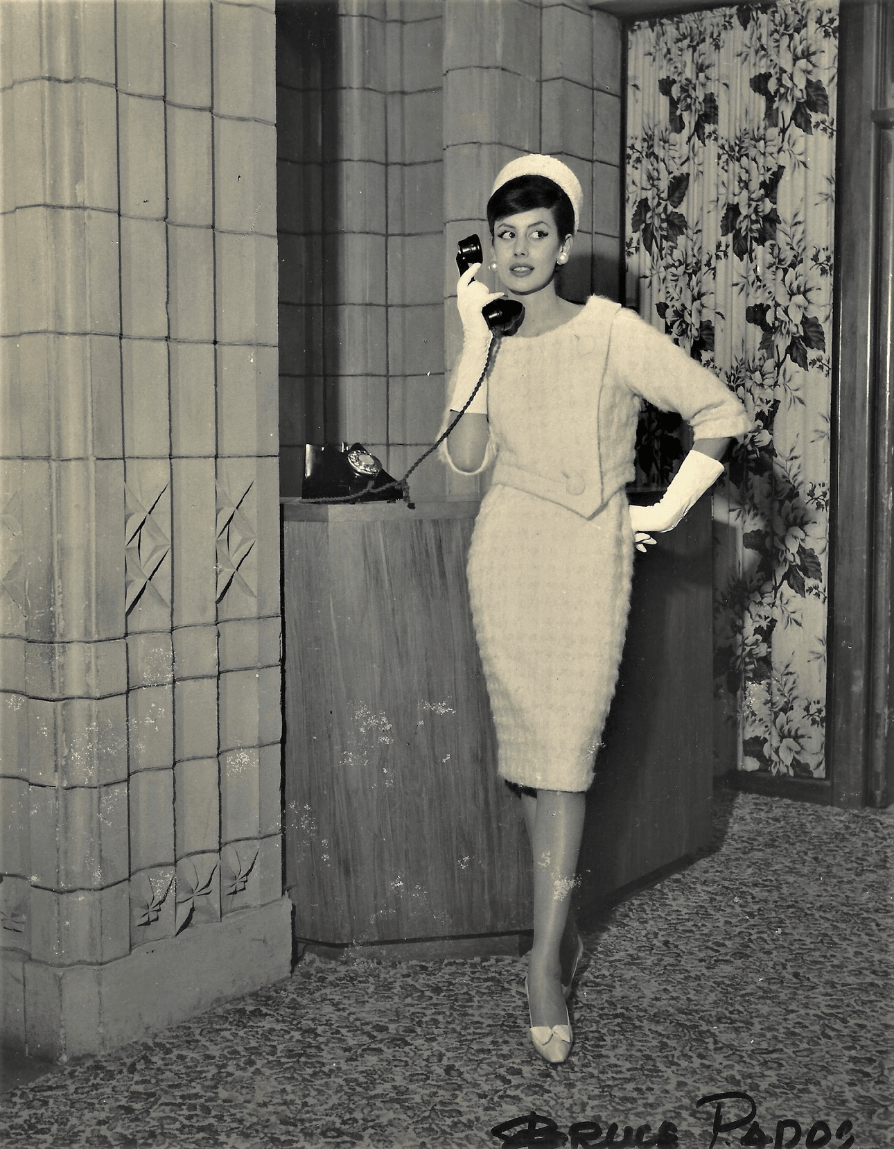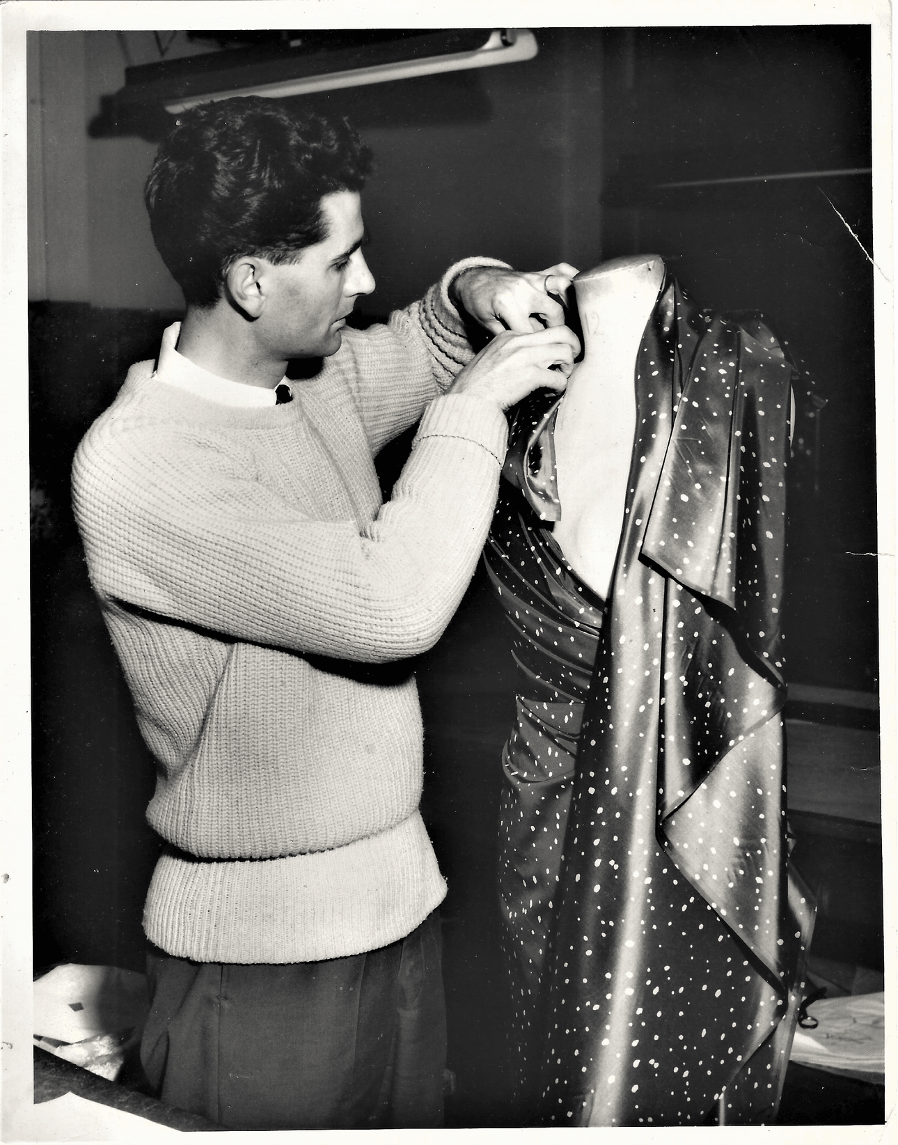 When Bruce started his apprenticeship in 1946 the long shadow of the Second World War had not yet lifted. Wartime shortages of materials had led to government restrictions on the amount of fabric that could be used in a garment and so skirts had got narrower and hemlines went up. What was available was limited and creative designers worked within these parameters, using clever seaming, appliqué and embroidery to embellish their otherwise austere suits and dresses. Flora MacKenzie of Ninette Gowns in Vulcan Lane was one such creative who specialised in the use of embroidery and it was in this role, designing embroideries, that Bruce Papas began his fashion career. As well as designing and making intricate beaded collars, lapels and peplums, over his five year apprenticeship Bruce learnt the fine art of draping a dress and how to tailor a sophisticated suit.