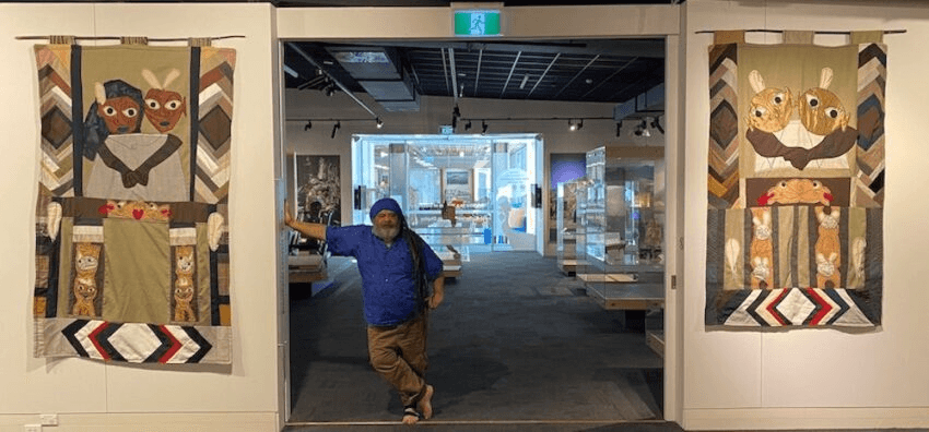 A sober reminder of his young Wellington years survives in The Gatekeepers series (2020), two quilts flanking the main door to the gallery. “These are for Chrissy Wihonga and Mary Baycroft, some of the women who watched out for us kids on the streets back then. They were the gatekeepers, like social workers, I guess. Their doors were always open and they were tough as old boots. Everyone was too scared to go to the police for stuff. Of course we should have, but you knew you’d just get the crap bashed out of you. So these men and women would keep an eye on us, just out of aroha.”