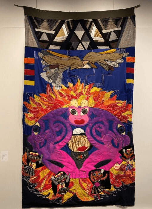 Whānau is honoured in Grandparents (2020) and Great Grandparent (2020). Again and again, the theme of Matariki is explored. The sometimes nine, sometimes seven stars of the famous cluster are featured as sister goddesses in several ways across several works. Two quilts feature Hine Te Iwaiwa, atua wahine of birth, weaving, fabric artists and poets. In his quilt Thoughts Forming in the Void (2018) she’s depicted in a radical departure from her usual representation of serene and holy mother. Instead, she bursts forth in virulent purple, harnessing the raw power of birth and motherhood and burning through the sky like a comet.