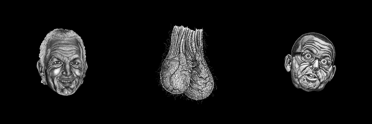 How do I describe Hannah Salmon’s work? Francis Bacon at a hen’s party gone terribly awry? Julie Doucet illustrating a Mitre 10 barbecue expo catalogue? Escher, if he was more into dicks than staircases? As an art moron, the right cultural references are beyond my grasp. Some of Salmon’s drawings are almost medical in their execution. In Meat Face, John Key’s head appears in all its smirking, ham-boiled glory, sweat glinting off his forehead like alpine snow. You get the feeling that the doctors of the future will be able to identify many undiagnosed tumours from this picture. A lot of her work can be found on album art and gig posters (many for her band Unsanitary Napkin). She can draw a ball-sack better than anyone alive, and even her portraits have a genital-like intensity to them. Some of her landscapes evoke old Soviet science-fiction vistas, forests and stars and lichens, otherworldly and precise. Her work has an intensity of darkness to it, which draws the eye in like a vacuum.