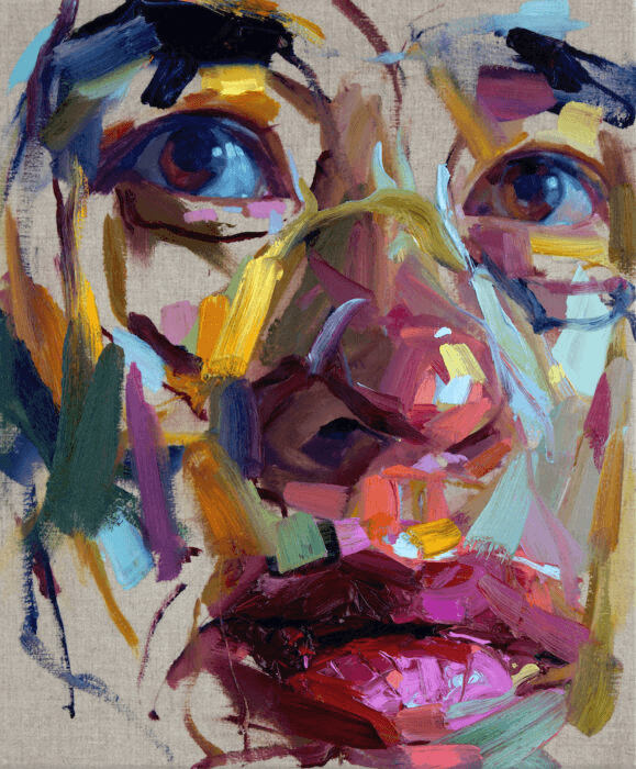 In ‘Moss’, the mid-green eyes bring to mind a character in a Mike Leigh film. Is she somebody’s worried mumsy, feeling muted, but painful emotions, while pleading, or acquiescing? Or, is she broken or breaking open? Is she proud? Wide, thickly painted strokes of light green and orange make moss aesthetically present. I remember the phosphorescent moss I’ve seen on slim, even trees in woods in Vancouver; the way in half light, moss appears forward like a sign from the gods.