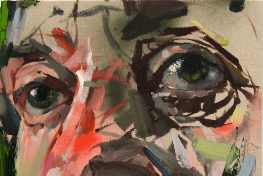 The blue eyes in another painting, ‘Bones’, look tired. Maybe his subject is exhausted. Maybe her gentle face is just watching something distant, her mouth uncertain. There are dark greens and browns that harness the work to the earth. Jack feels this painting does what he dreamed for it. Some devastation, some hope. Sometimes when he walks past the studio he says she looks peaceful.