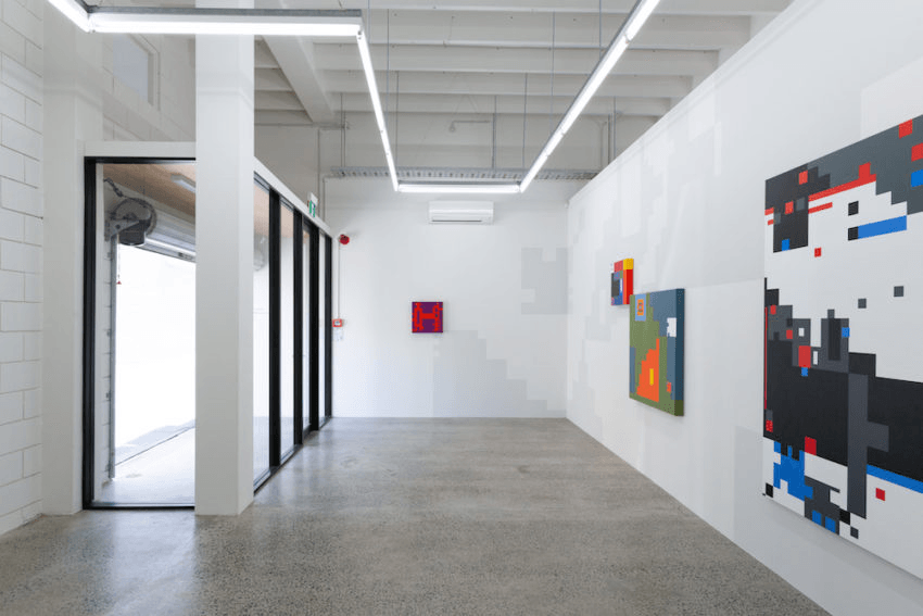 Until February 29, Sumer is showing the work of established local painter Kelcy Taratoa – smartly, at the same time as a survey of his art at the public gallery. Working to the boxy architecture with giant pixelated abstraction, Minecraft-like blocks of data spread across both canvases and the walls of the gallery, responding in part to the poutama pattern outside. Taratoa has consistently painted about urban alienation, and the Minecraft analogy makes me think of those modular housing blocks and their attendant roading systems extending out like topsy across the Papamoa plain.