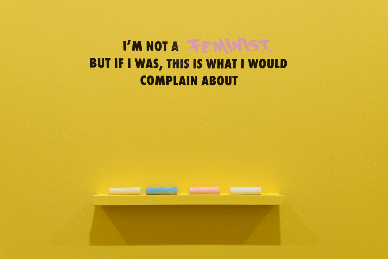 The Auckland show includes the chalkboard work I’m Not a Feminist, but If I Was, This Is What I Would Complain About… on which visitors can write their own concerns.