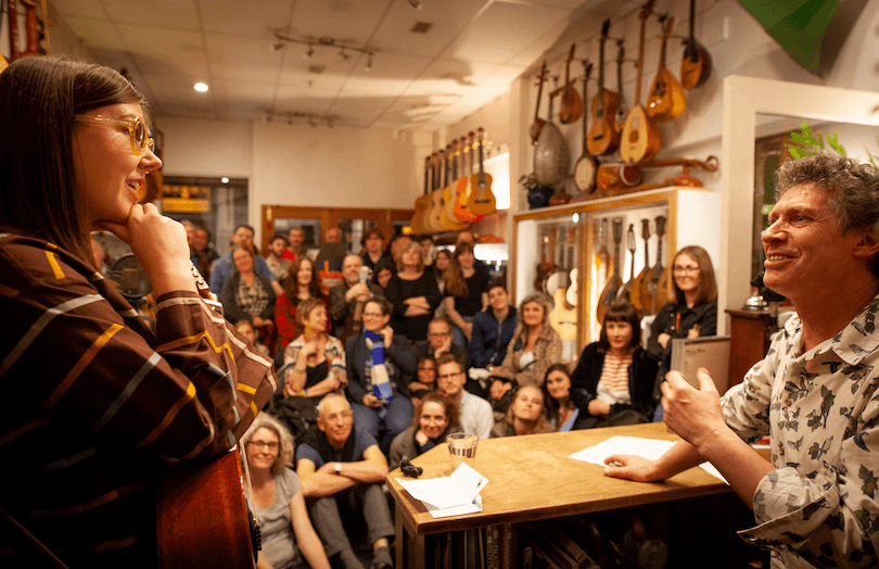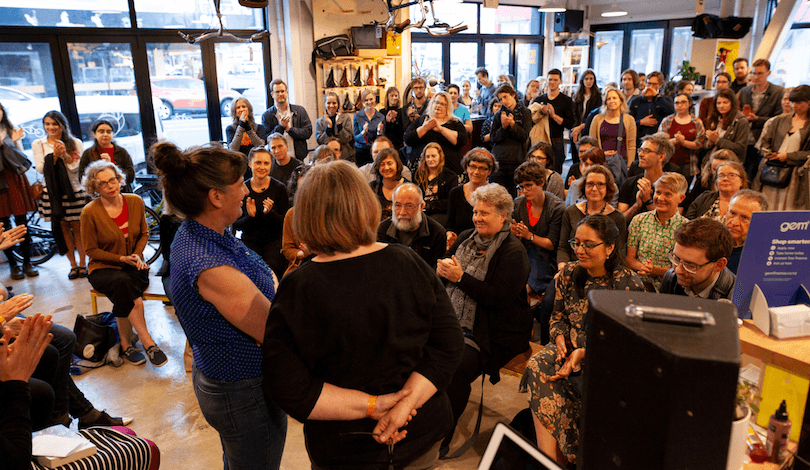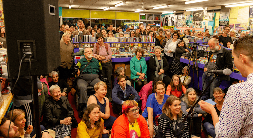 Crazy to feel the need to rush to a literary event – there’s always plenty of room, it doesn’t matter if you’re a tad late – so I leisurely ironed my shirt in my hotel room, brushed my shoes and teeth, and rehearsed a dozen different faces to greet the world before stepping out onto Cuba St in Wellington on Saturday at 6:03pm to attend a 6pm live poetry session at LitCrawl 2018. I walked down the street to the venue. About 20 people were standing outside Hunters & Collectors and trying to see inside. They couldn’t see anything; they couldn’t see over the heads of the people who crowded the doorway. They couldn’t hear anything; they were prevented by the distance and also the traffic on Cuba St. One by one they left and I got closer to the door. I couldn’t see or hear the poets who were performing but I could see the place was packed wall to wall and to the rafters – people upstairs had to draw in their neck to avoid cracking their head on the ceiling. O literature in public places! O LitCrawl, that annual miracle of staging, which programmes one event after another, and indeed eight at the same time for hours on end. Only in Wellington; only a fool would risk missing out because they felt the need to iron their shirt.