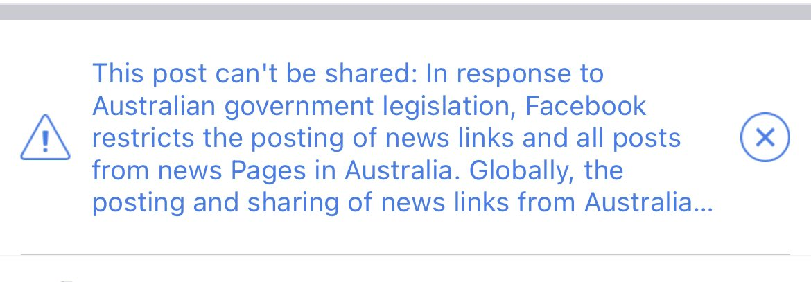 Those paths are dictated by the business models and temperaments of both companies. Google, after making a forceful case against the code and threatening to pull out of search altogether in the Australian market, has decided that the “least bad” route is to pay off news companies and avoid being subject to the code altogether. Facebook has avoided the code by doing something Google practically could not, banning news links altogether. Now when an Australian user tries to cut and paste a news article into the social network they are met with a “computer says no” style pop-up.