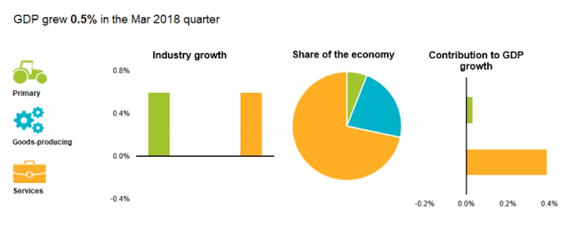 Behind the headline number (which also comes in a yearly version, 2.7% for the year ended March 2018), we can see how smaller lumps of the economy have fared; service industries’ activity grew 0.6% in the quarter, “easing” (cough) from 1.1% in the previous quarter.