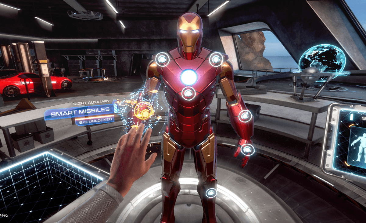 The first few moments of Iron Man VR are where it plays its hand, confidently and assuredly. You hold your palms out in front of you, and Iron Man’s shiny, red-bronze suit-hands follow suit. You press a button to engage Iron Man’s thrusters, moving your hands by your side. You then turn your palms behind you, and you, as Iron Man, fly forward across the Pacific Ocean. The Sony Interactive Entertainment flies past you, followed by the famous Marvel logo. Then finally: Iron Man VR. You’re flying, and you, in your lounge or designated gaming area, are Iron Man.