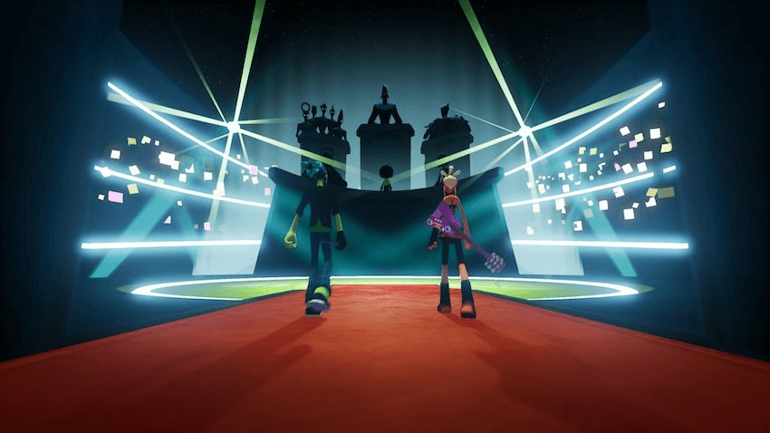The premise of the game is light and intentionally silly, just the right foundation to lay some complex gameplay on. The player takes on the roles of Mayday, a hyperactive rock guitarist, and Zuke, a laconic drummer, who form the indie rock band Bunk Bed Junction. While the game starts with the duo auditioning for NSR, a corrupt electronic record label that also happens to govern Vinyl City, a futuristic techno metropolis, the band is quickly turned down, and so the player follows Bunk Bed Junction taking Vinyl City back for… rock.