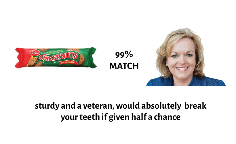 There are two ways that biscuits can be eaten: on their own (cold), or with a drink (hot). Chocolate Butternut Snap is a medallist in both categories: it’s the second best biscuit to eat on its own (behind Yellow Squiggle) and the third best to dip (behind Tim Tam Double Coat and gingernuts). This is why it has to be number one. Meryl wishes she had such range.