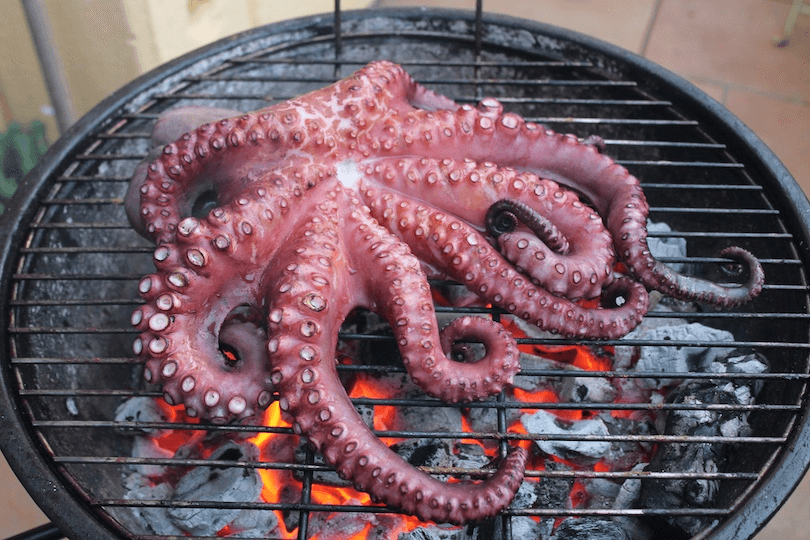 Grill on a barbecue with a sprinkling of salt and olive oil. Once grilled, add crushed garlic to hot olive oil (make sure not to burn the garlic), add parsley and drizzle over the grilled octopus. / José Barbosa
