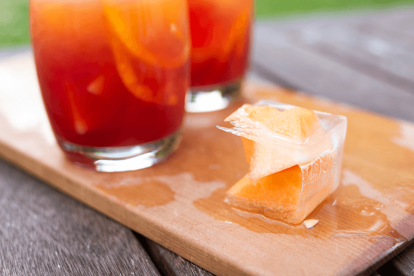 To serve, pour over melon ice cubes and garnish with an orange slice. Enjoy.