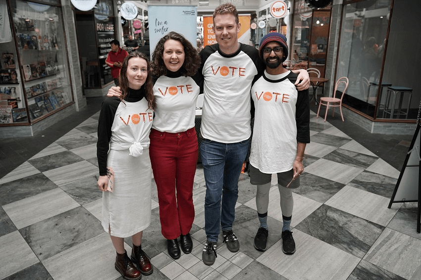 Sitting at home filling out a confusing form hardly connects us to the wellbeing of the collective. One of RockEnrol’s missions is to make voting less lonely and more social, which is why in my work as the Auckland election campaign coordinator, we have a focus of bringing voting into public spaces. Last week, we hosted a stall in St Kevin’s Arcade on Karangahape Road where people could enrol and vote at the same time. Volunteers pulled people in off the street to invite them to have their say in our collective future.