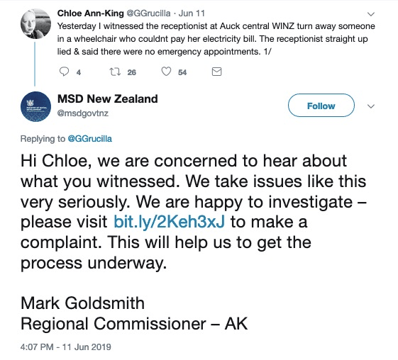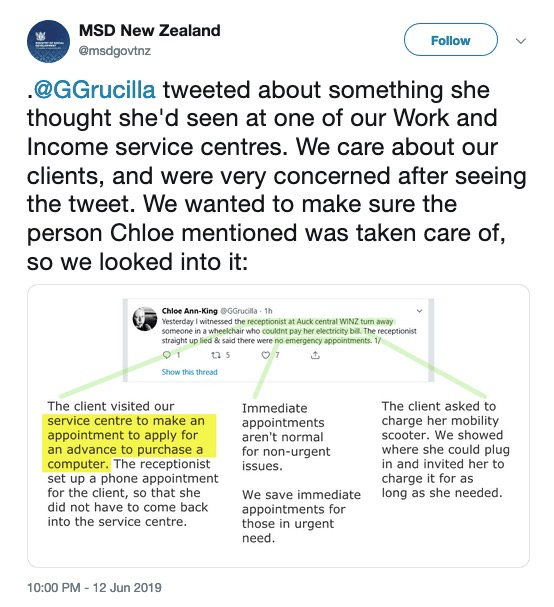 Yesterday, the Ministry of Social Development tried to defend themselves on Twitter. They publicly responded to a tweet from Chloe Ann-King, a well-known advocate for workers and beneficiaries about a situation she overhead in a central Auckland WINZ office. And when I say publicly, they didn’t just reply to her tweet. They doubled down, going on to publish a forensic review of the information, complete with two different colours of highlighter and little lines, highlighting what they believed to be incorrect about what Chloe was saying.