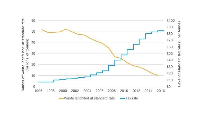 The TWG recommended increasing the Waste Disposal Levy, currently $10 per tonne at landfills that accept household waste. The TWG noted the effect of increases in the equivalent levy in the United Kingdom as illustrated by the following graph.