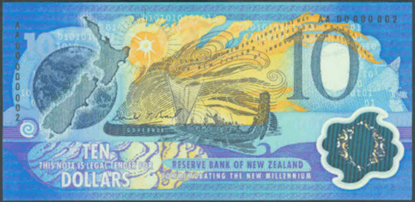 Another snazzy fact is that the note does not feature a single portrait. “Instead it depicts a Māori waka (canoe) sailing towards the sun on the obverse side, with the words ‘The dawn of a new era lights the way for New Zealand’s perpetual voyage of innovation and discovery’ within the clouds,” the Te Ara site reads. On the flipside you’ll find people surfing, skiing and kayaking, with the achingly optimistic phrase ‘Celebrating New Zealand’s free spirit and quest for adventure in the new millennium’ weaved in between.