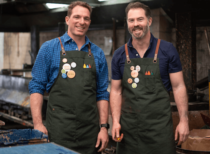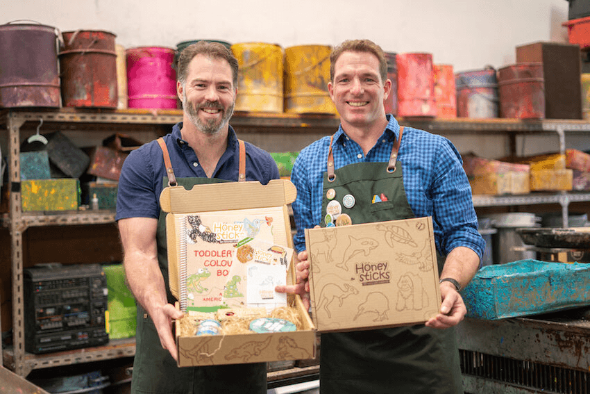 Inside the Honeysticks factory in New Lynn, Auckland, it’s all go. The machines are cranking out the beeswax and soy-based crayons, the team is busily stuffing them into their cardboard packets and co-owners Will Radford and Luke Thompson, resplendent in their branded green aprons, are getting their hands dirty on the factory floor.