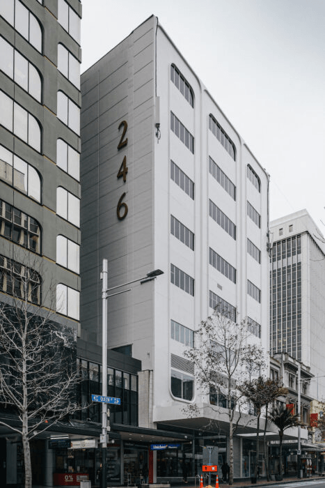 At 246 Queen Street, a new retail, hospitality and office redevelopment is a tribute to the glory of midtown in the 1960s and an investment in the potential of the street’s economy. Developed by Wilshire Group, the building has now opened with the first tenants in place, and sales and operations GM Christie Wrightson says she wants the revitalised building to highlight the often neglected heritage of modern New Zealand architecture. The building was opened in 1964 by the late cinema proprietor Sir Robert Kerridge. It housed many high-end stores and hospitality offerings, including the exclusive Christian Dior boutique El Jay Chapeau.