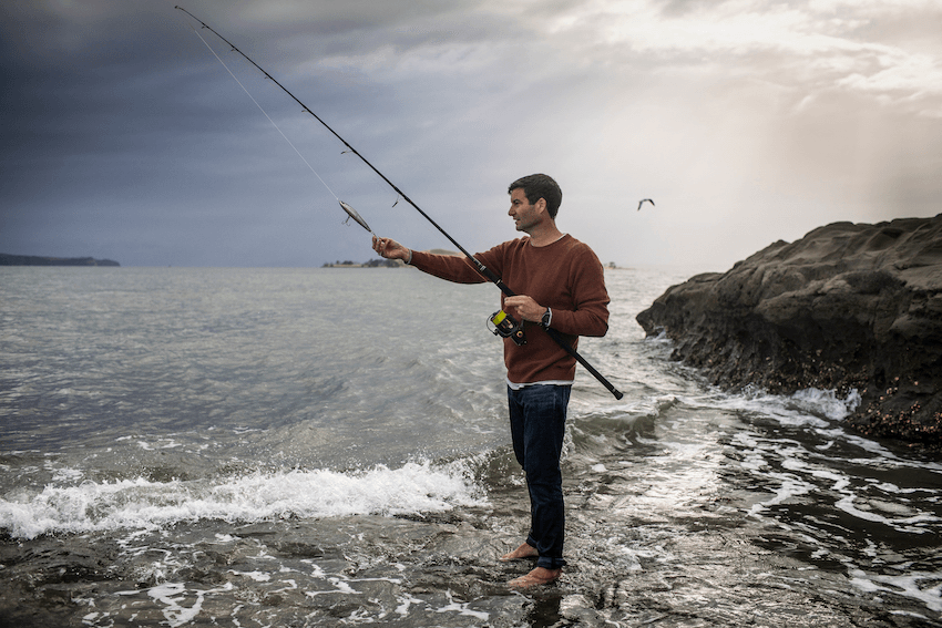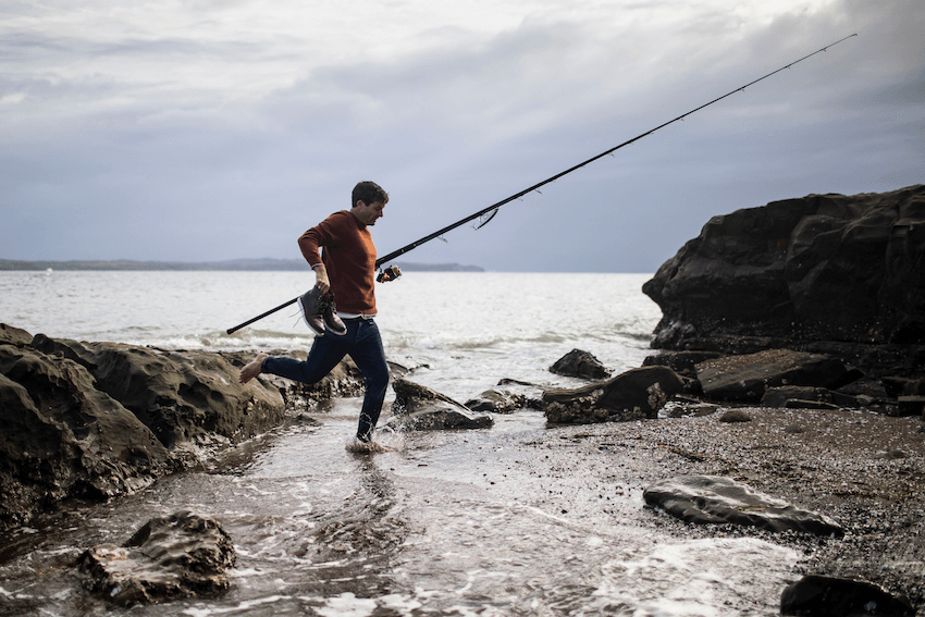Mid-week, mid-morning under a muddy grey January sky. We’re skimming into the Hauraki Gulf on a stupidly expensive boat, stacks of fishing rods wobbling away, and Clarke Gayford is getting technical. “So on the handle, as it comes up around, there’s a little black lip, which sits on the sleeve, if you run your hand up to where you grip it.”
