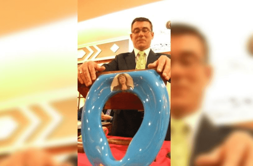 During an exclusive interview in her Auckland hotel room in June, Curran brings out a plastic folder of grainy images from a debate held before the National Party’s Mainland Region conference in April 2012, attended by MPs including Nick Smith, Michael Woodhouse, Jacqui Dean and Eric Roy. They were posted in a Facebook group that was “not quite private”, and later sent to her. One of them shows Woodhouse posing with a bright blue toilet seat emblazoned with a photograph of Curran.