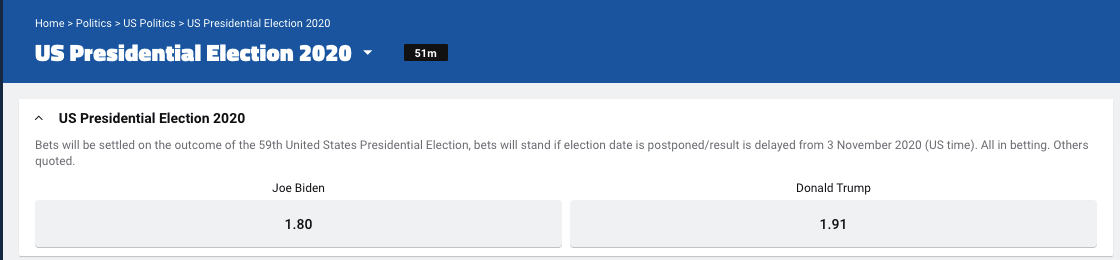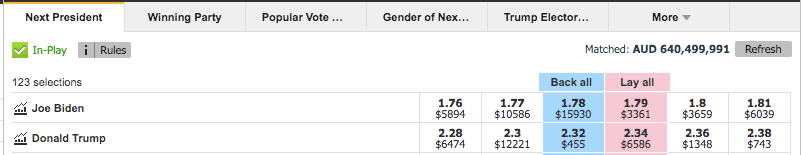 Take these with a huge grain of salt, but betting markets are starting to give better odds of Donald Trump winning, after having heavily favouring Joe Biden in the morning. Here are the current odds on Sportsbet, Betfair and Ladbrokes respectively.It appears that some of the swing is down to Florida looking promising for Trump – the New York Times is now predicting the president is overwhelmingly likely to hold on there. That is a must-win state for Trump, and without it he doesn’t really have any pathway to victory.