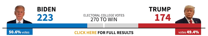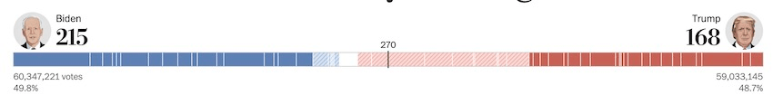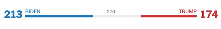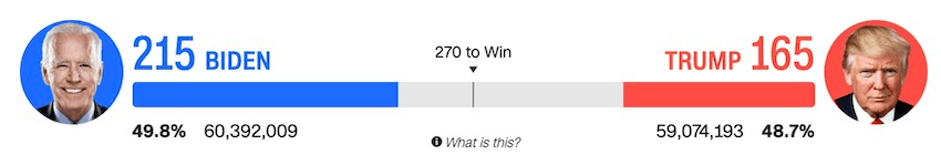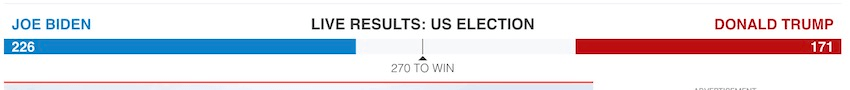 A scan of the major US and NZ news sites intriguingly shows that NZ’s two major online news sites have a small but still larger number of electoral college votes called for Biden. Stuff is the boldest, at 226, with the Herald not far behind on 223. Of the major US news sites, CNN has Biden on 215, as does the Washington Post, with the New York Times a hair behind on 213.