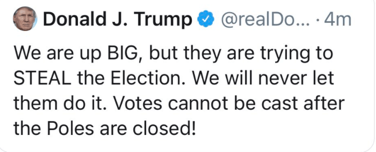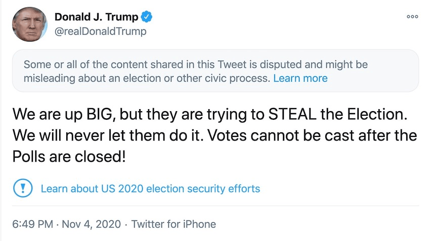 The moment many feared has already happened: in a tweet, Donald Trump has claimed his opponents are trying to steal the election. His tweet was flagged as misinformation by Twitter within seconds of its appearance.