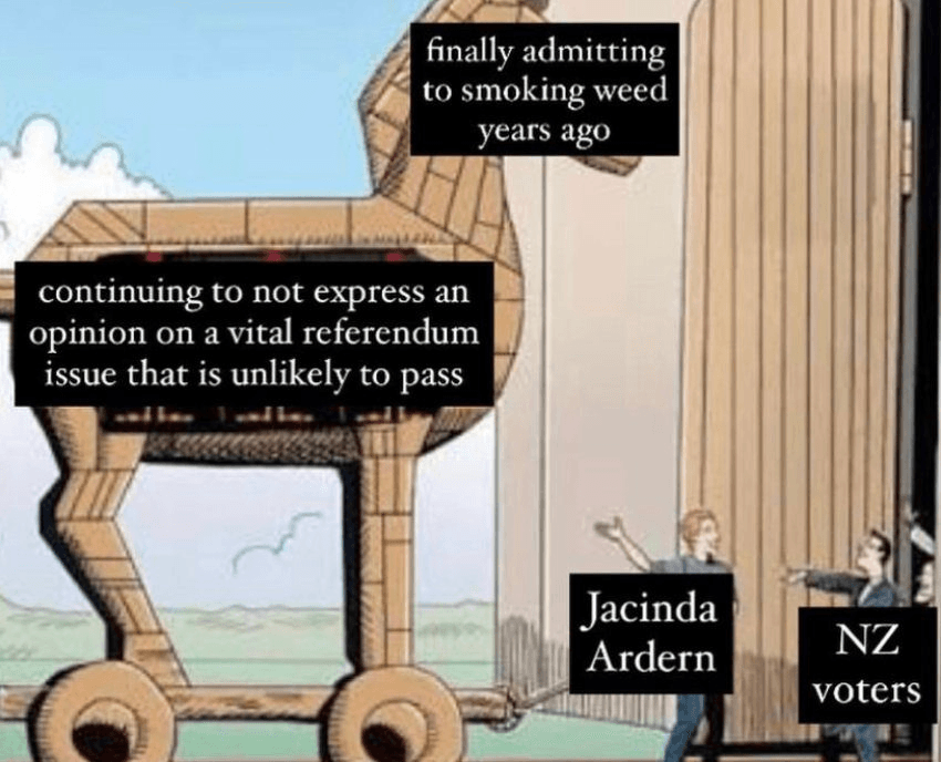 During the Newshub leader debate last Wednesday, the prime minister finally admitted to smoking weed at some point in her life. Previously Ardern has acted coy when asked the question usually replying, “I was a Mormon and then I wasn’t,” which honestly could mean literally anything. But on Wednesday she gave the green (wink) crowd a tiny nugget (wink wink) with her admission yet still refused to say which way she would vote. Particularly unhelpful given the current pessimism about the prospects for a yes vote but very helpful for Ardern’s relatability rating.