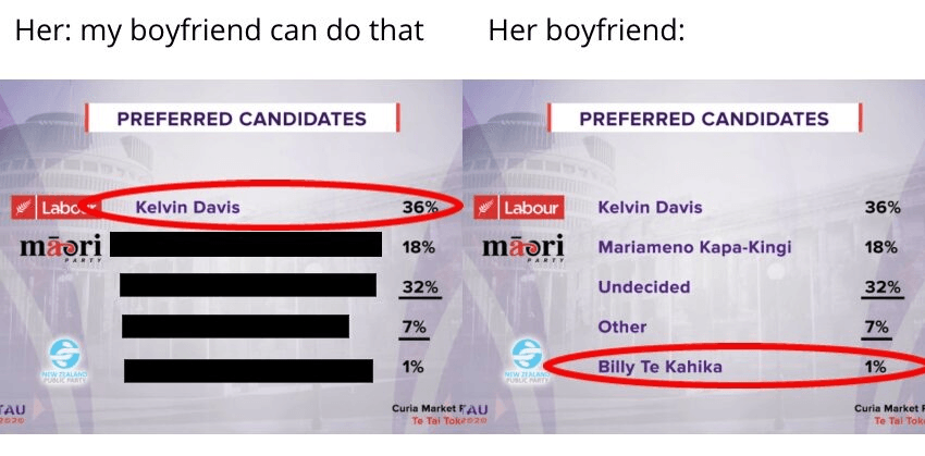 For a whole four weeks I forgot that Billy TK, leader of Advance NZ and fan of dangerous conspiracy theories, existed and that’s my privilege. Te Kahika is very popular on social media and posts a lot of nonsense about 5G causing cancer and other such pleasantries. His posts have been shown to contain a lot of “half truths” and never was that more apparent than when he and fellow party member Jami Lee-Ross said that Te Kahika was polling well and on track to win Te Tai Tokerau. In reality, Te Kahika is barely making single digits in the polls. I’m sure he’ll find a way to stretch that truth too.