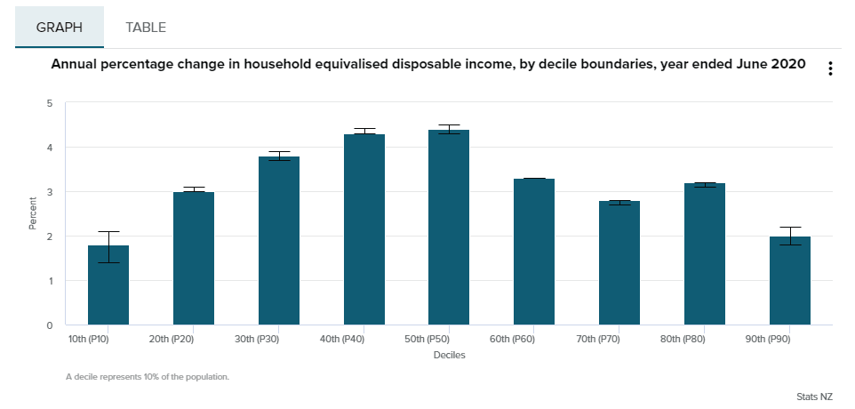 But that increased income wasn’t evenly distributed. Central to this story is the graph below, which shows the income increases for nine groups of New Zealanders, running from the poorest on the left to the richest on the right. As can clearly be seen, the groups traditionally identified as “Kiwi battlers” – the predominantly working families on low to middle incomes – benefited the most, their income increases clearly outstripping those of the very poorest.