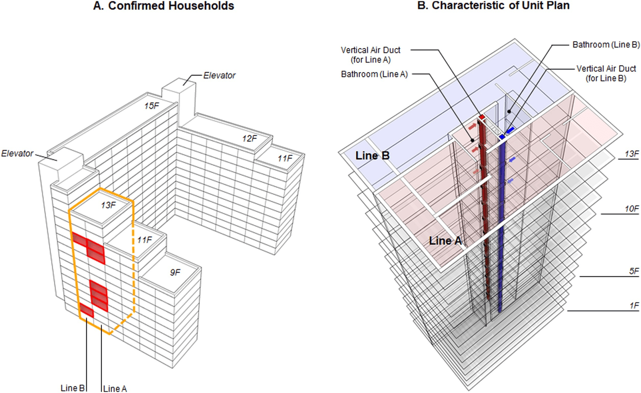 Seo Eun Hwang and colleagues have recently published their study of infections in a high-rise apartment block in South Korea. The block is shaped like a horseshoe with between nine and 15 storeys and as many as 21 apartments on each floor. The building also has natural ventilation shafts that run along each vertical line from the rooftop down to the bottom floor. Each shaft is connected to the apartments through what the authors describe as a “blowhole” in the bathroom.