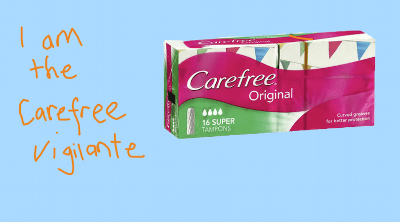 There are loos all over this country that I’ve left a spare tammy in, hoping that it might be of use to someone caught in the lurch. It’s me, I’m the phantom Carefree leaver, I confess. I couldn’t be a secret vigilante any longer, I’m unmasking myself.