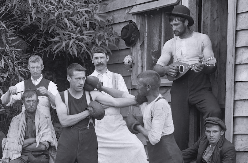 The photo I found had been described in various terms. Captions in the New Zealand encyclopedia, Te Ara, described the the photographs variously as “Mates having fun” and “Hard cases about 1906”.