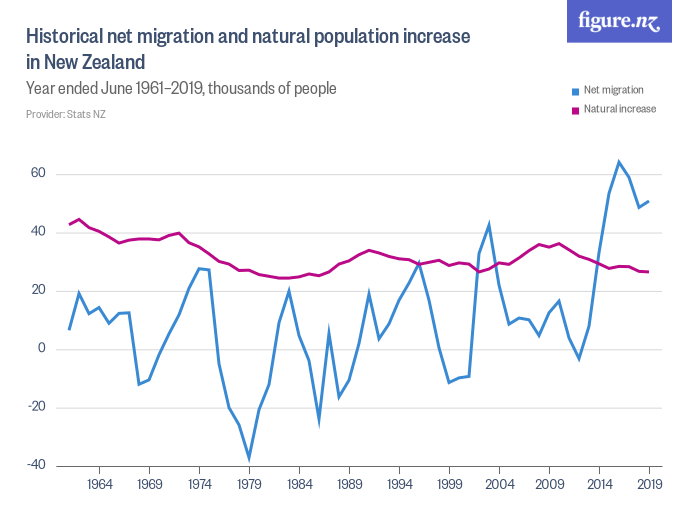 As fertility rates continued to decline, and reached sub-replacement levels in 2017, New Zealand was more than making up for it with migration numbers. The country was adding more than 60,000 people each year as a result of immigration.