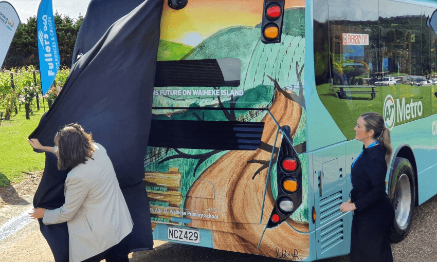 The buses were even adorned with artwork from kids at the local school. The winning entry was unveiled by newly minted Auckland Central (which includes Waiheke) MP Chlöe Swarbrick, who ripped the curtain away to reveal a quite beautiful scene of a dirt road running through rolling hills at sunset.