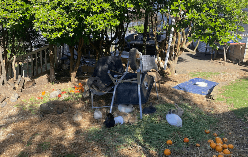 Why does Lewis have so many rabbits? Five years ago, he bought four from a local Animates pet shop, he told The Spinoff. One of them he got desexed, and the following night a cat wandered onto his property and killed it. After paying $200 for the desex surgery – and taking the sudden death as an omen – he refused to desex the remaining rabbits. Now, five years later, he’s lost count of how many rabbits are living on (and in burrows under) the property.