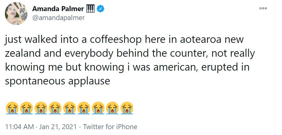 Joe Biden had barely finished calling for unity when Amanda Palmer posted a tweet that split New Zealand in two. Her message began innocuously. “Just walked into a coffee shop here in Aotearoa New Zealand,” she said, believably. But then, the kicker: “and everybody behind the counter, not really knowing me but knowing I was American, erupted in spontaneous applause”