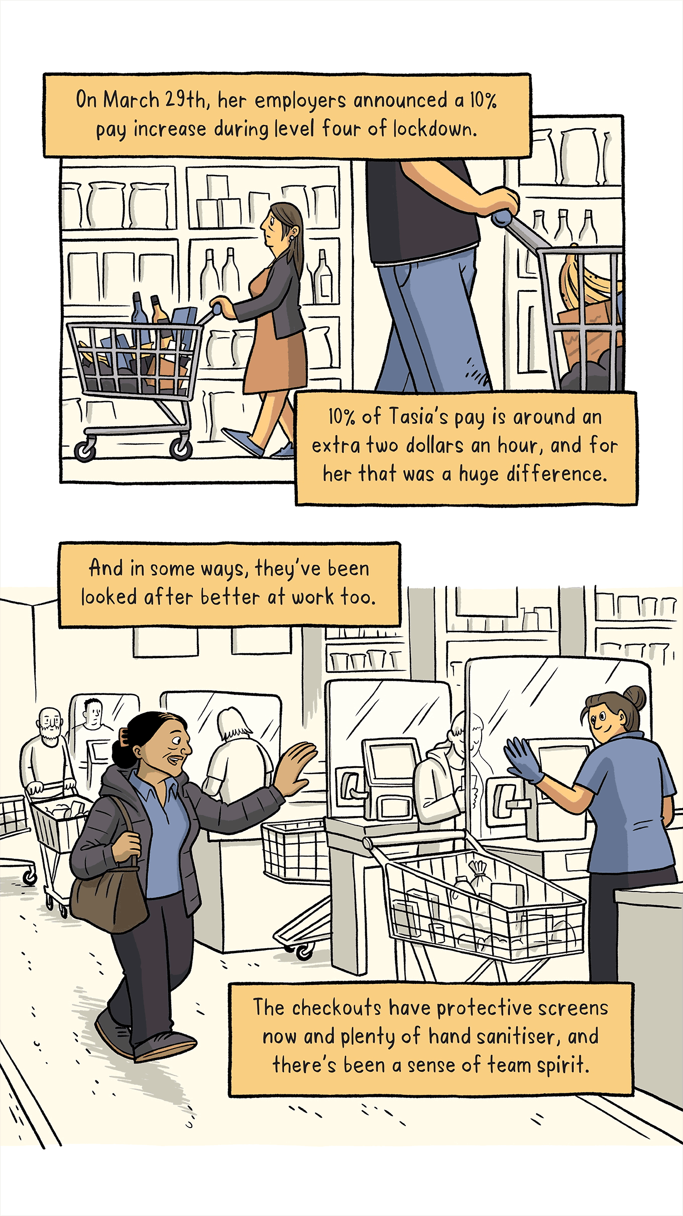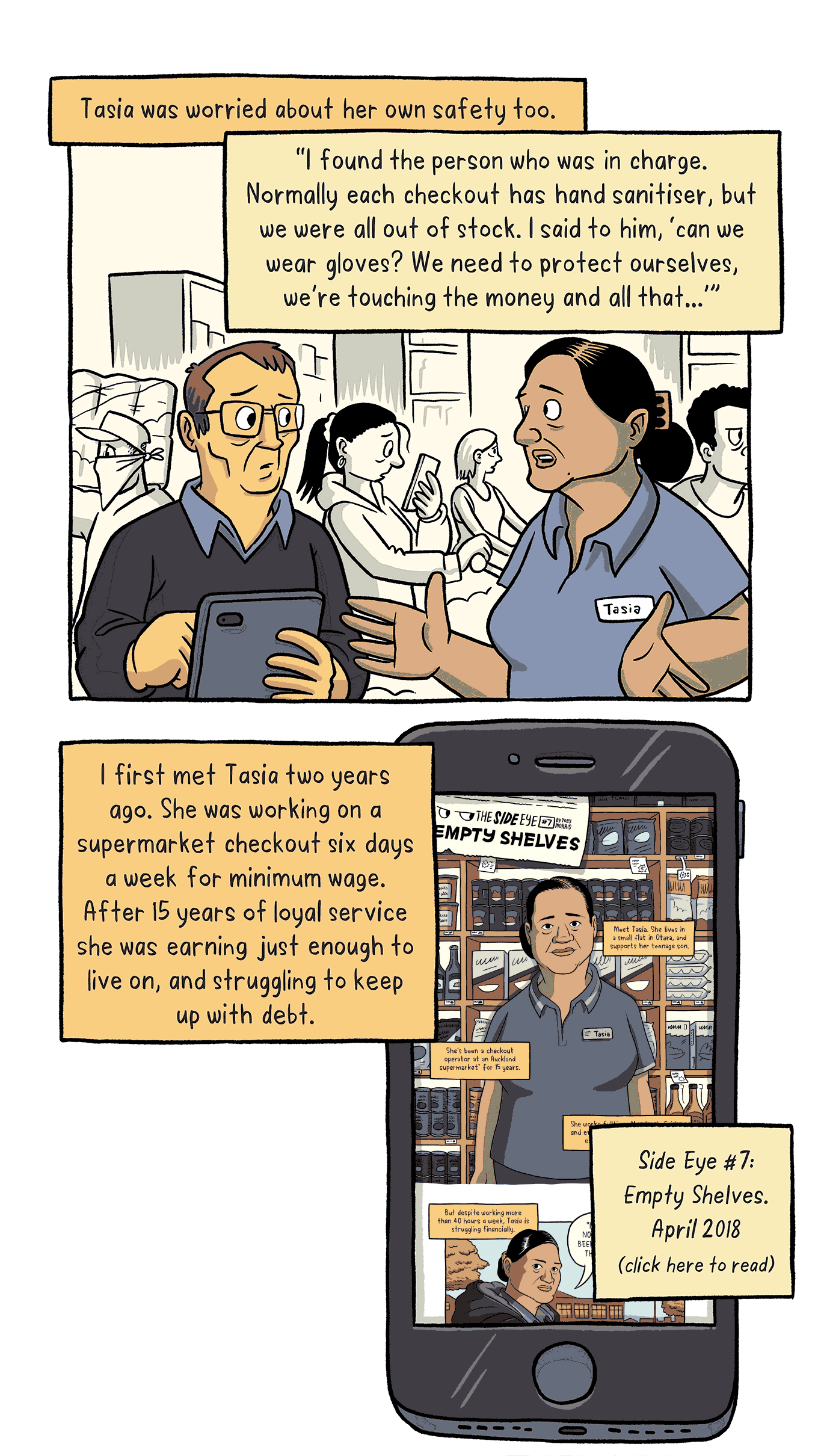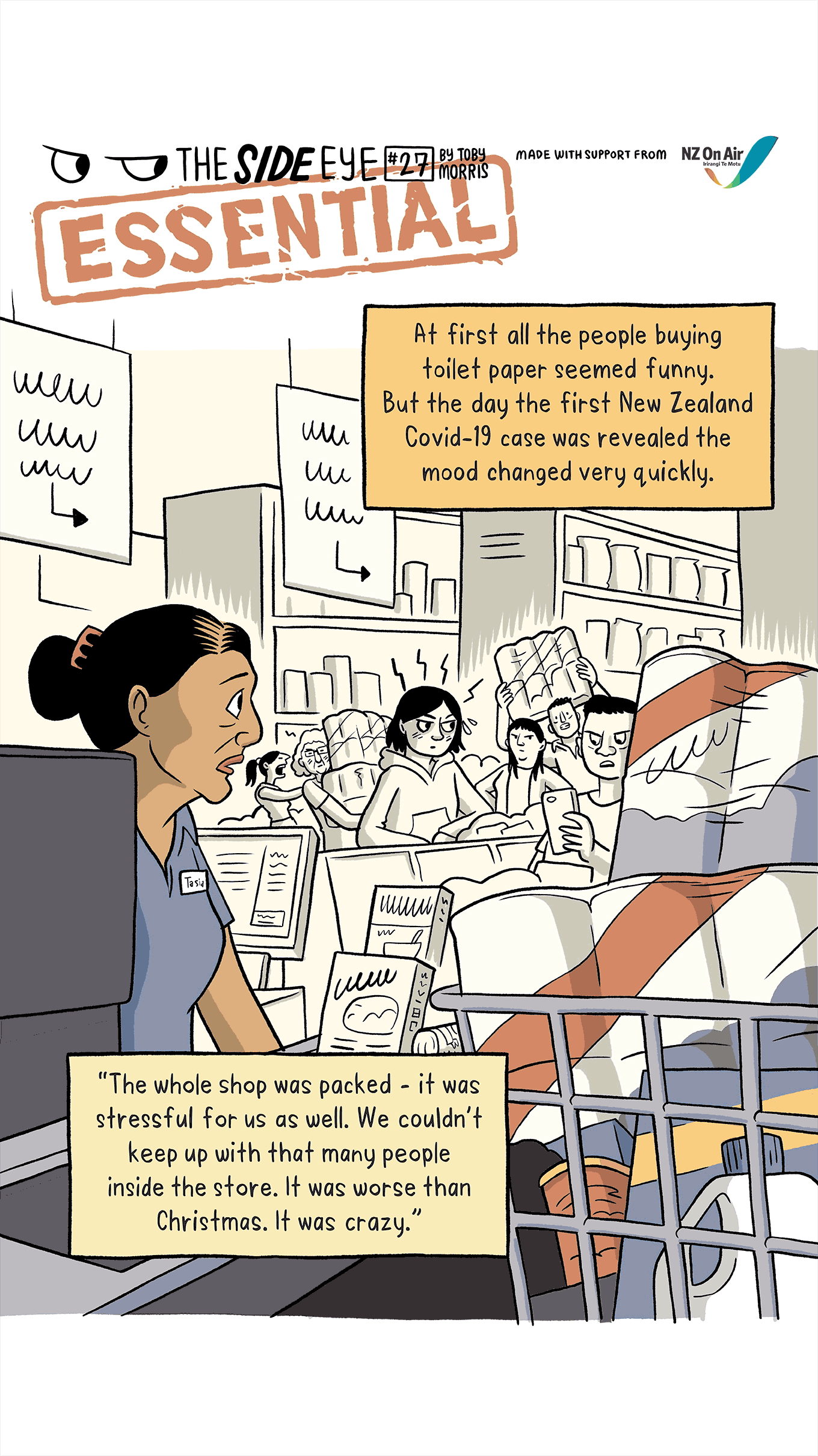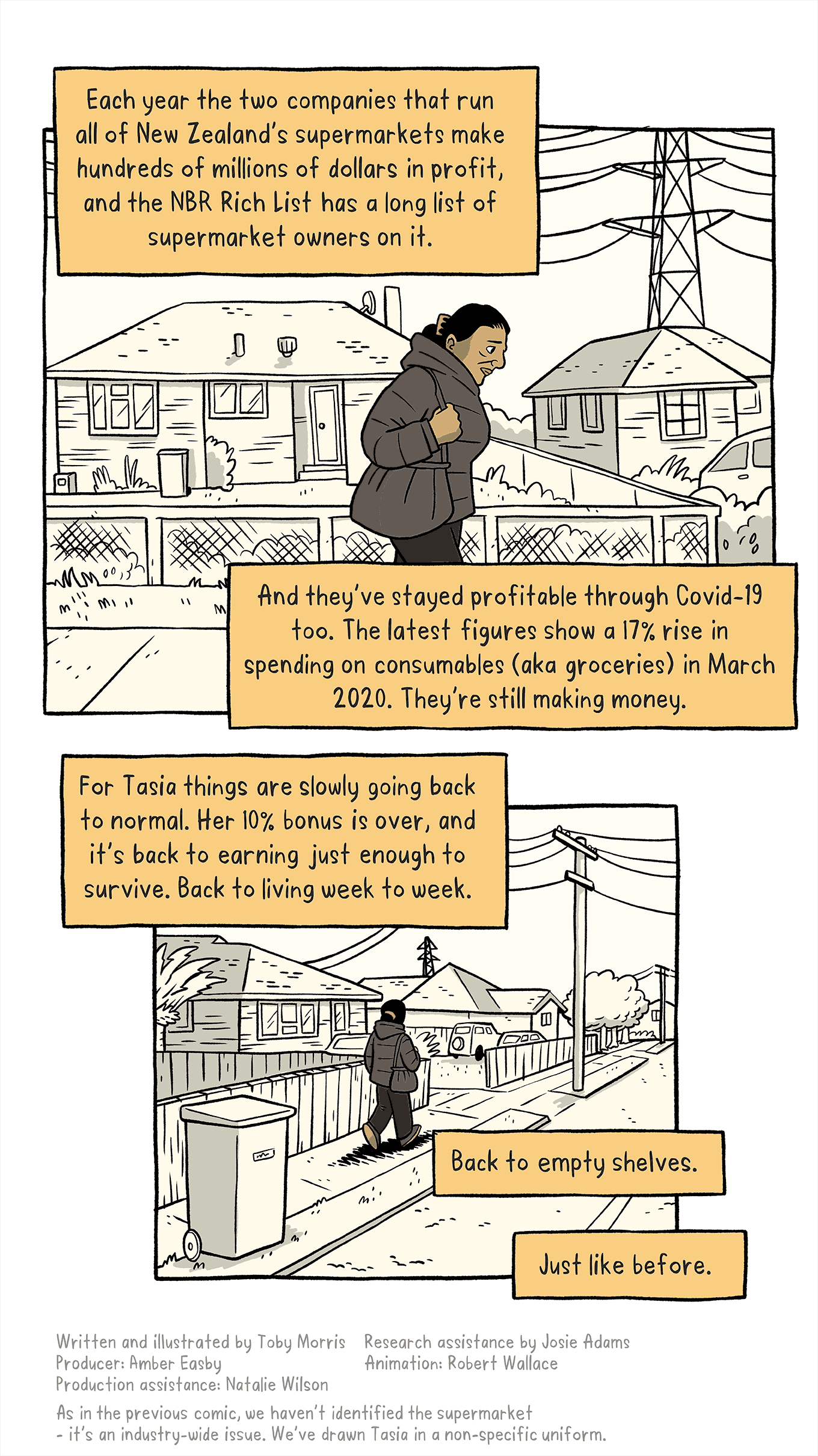 Summer reissue: Two years ago, Toby Morris met Tasia for the Side Eye comic ‘Empty Shelves’. As New Zealand emerged from the strict Covid-19 lockdown of alert level four, he caught up with her again, and found that while some things had changed, others had not.