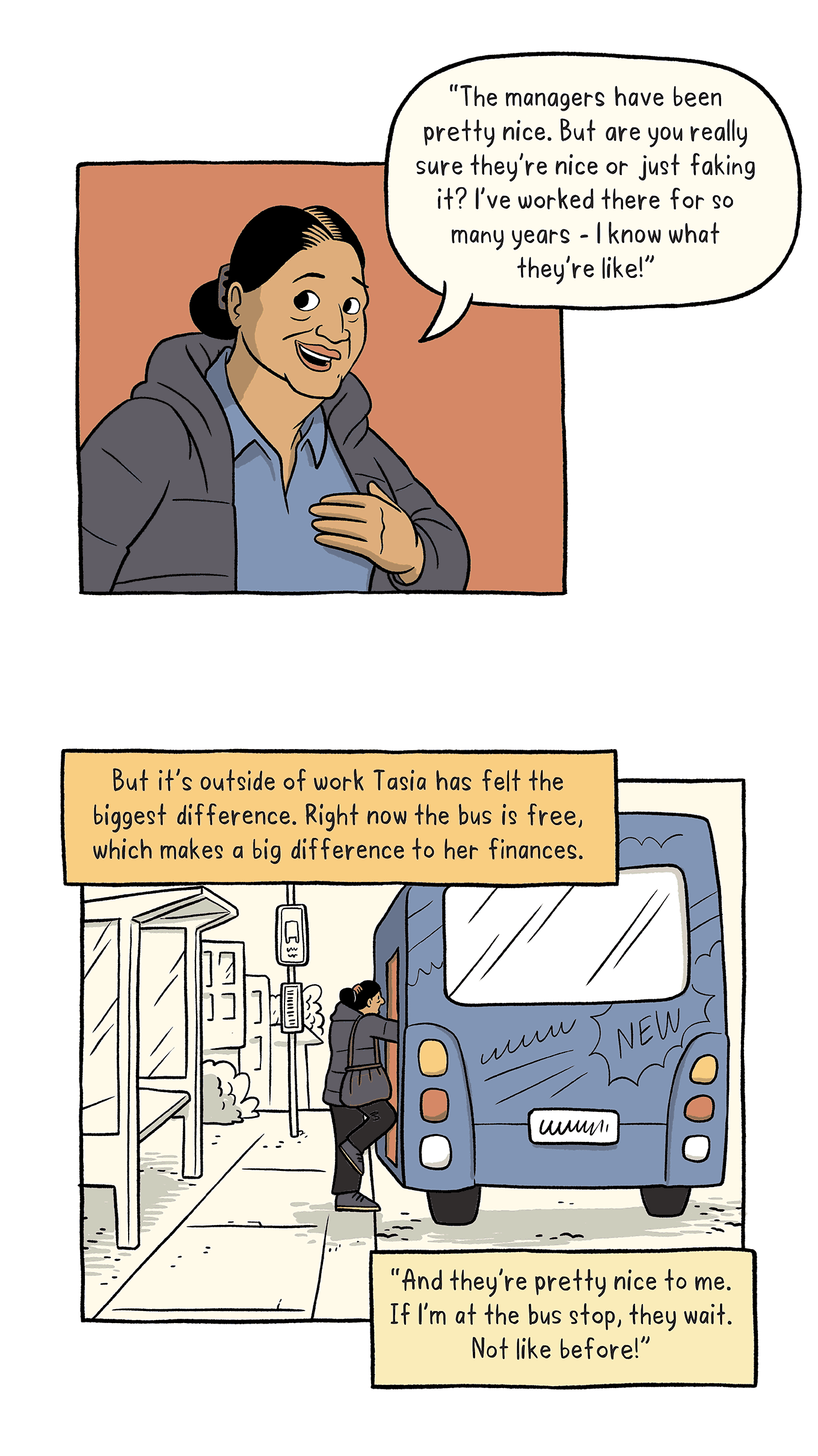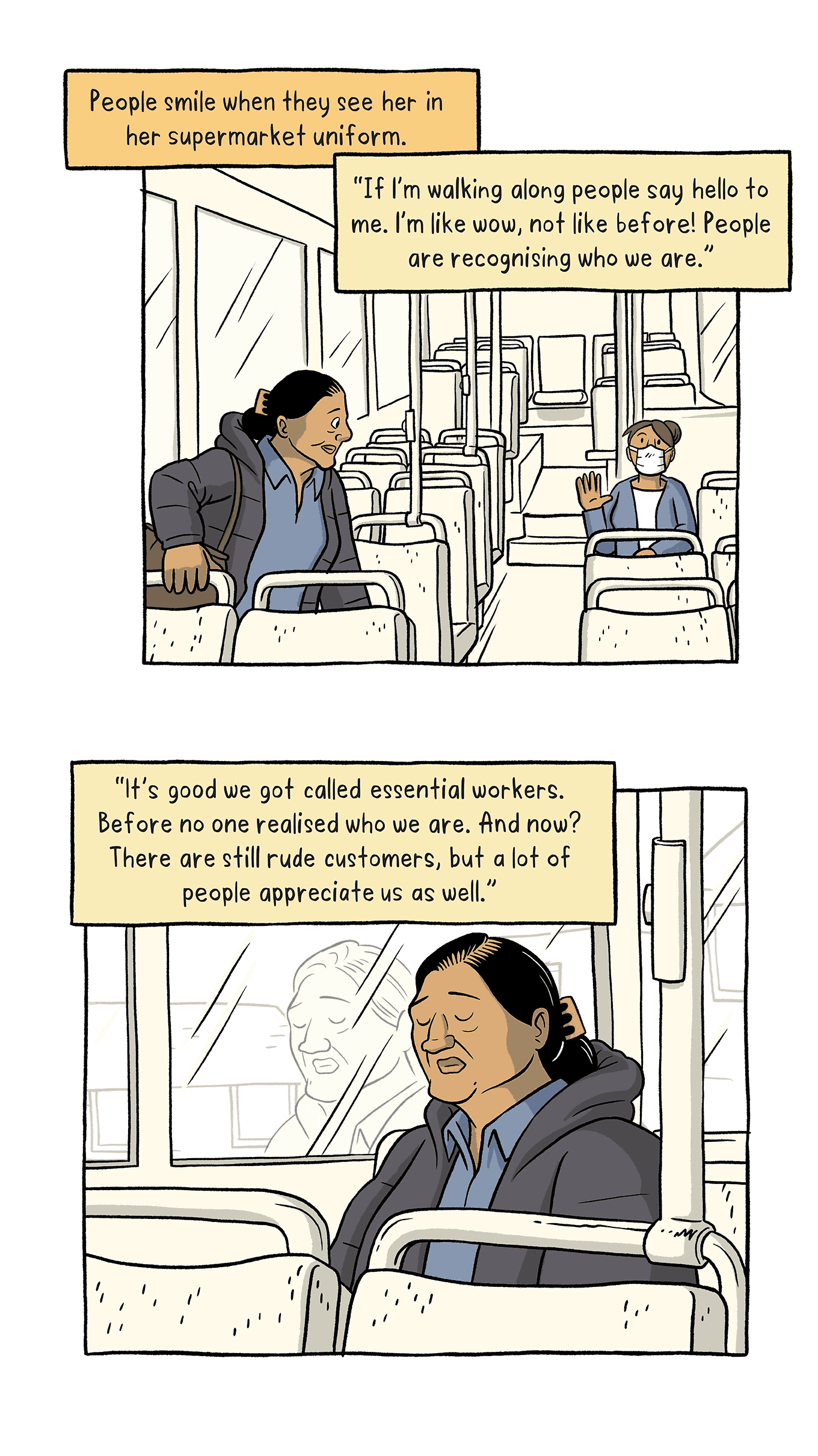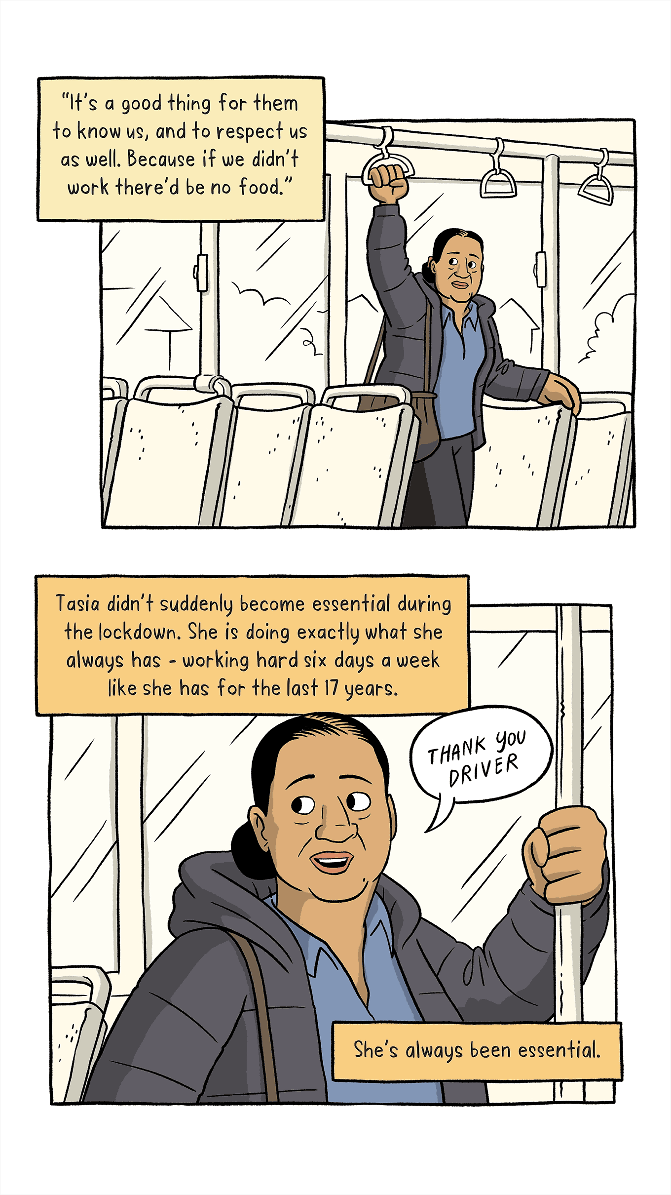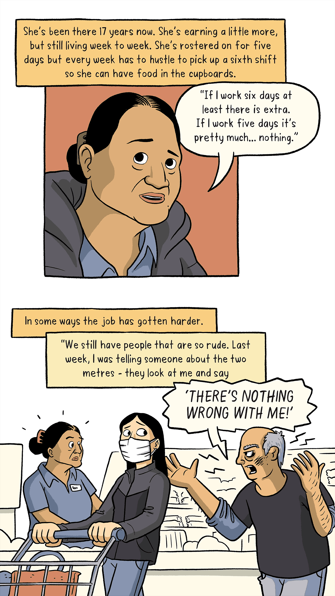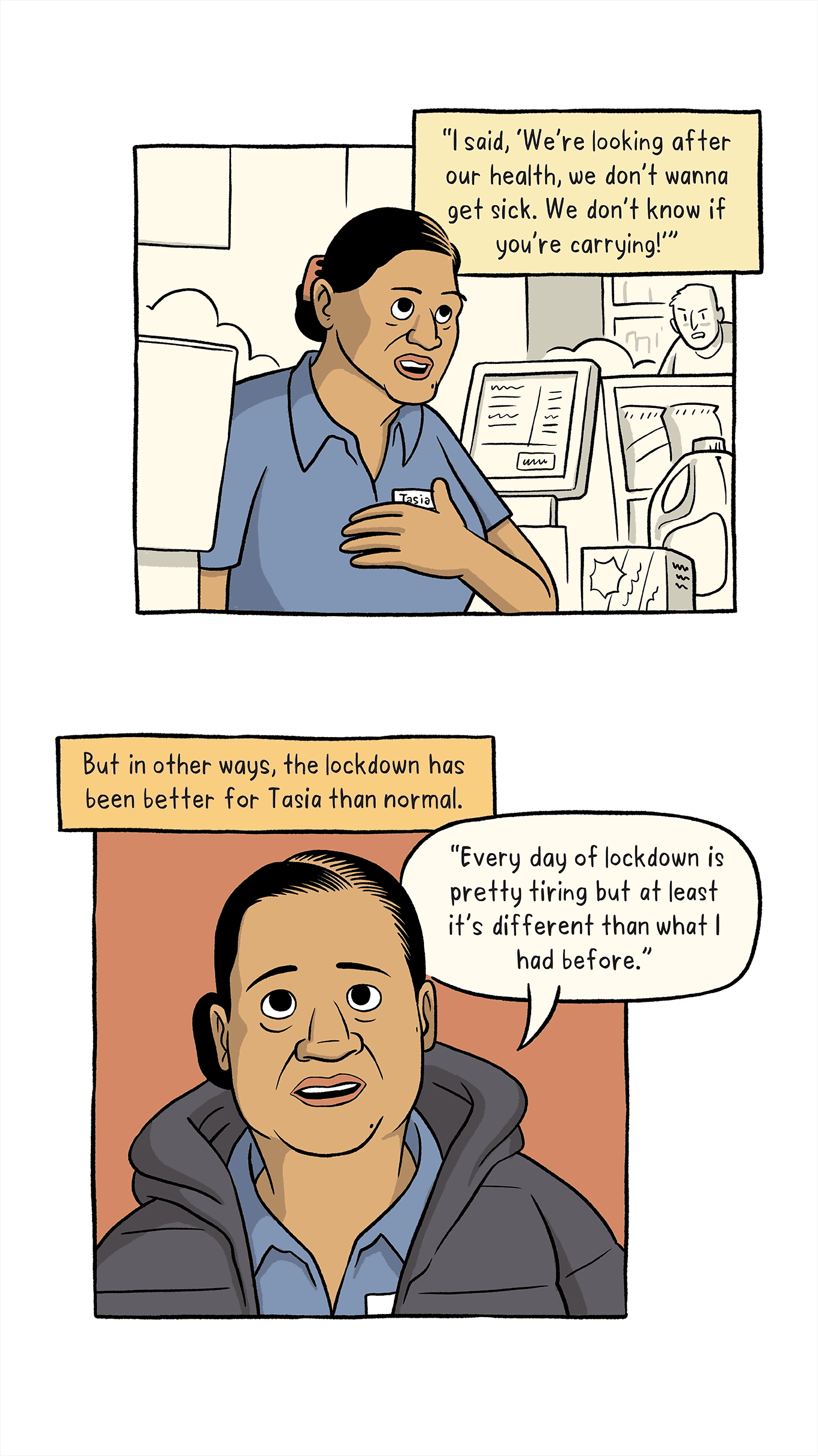 Summer reissue: Two years ago, Toby Morris met Tasia for the Side Eye comic ‘Empty Shelves’. As New Zealand emerged from the strict Covid-19 lockdown of alert level four, he caught up with her again, and found that while some things had changed, others had not.