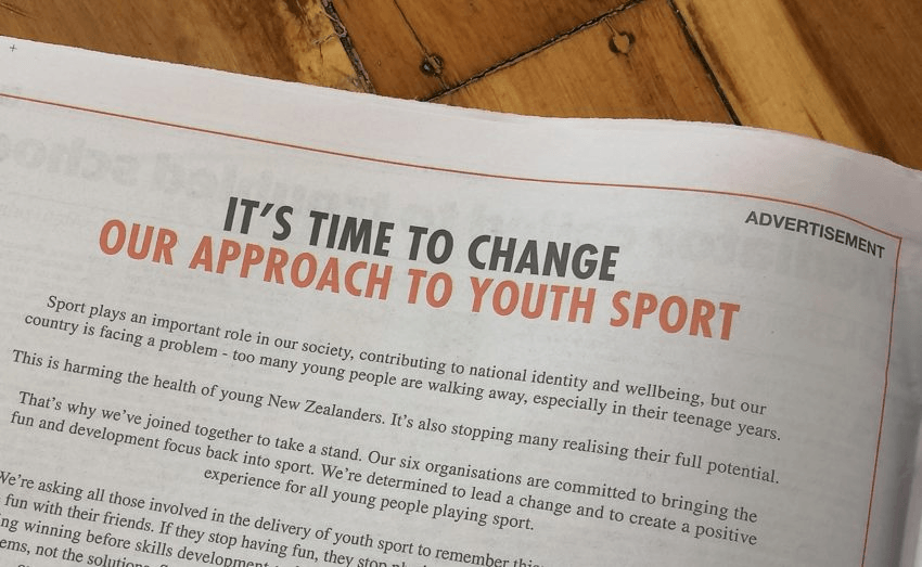 “It’s time to change our approach to youth sport,” went the all-caps headline in full-page advertisements placed in New Zealand’s three major daily newspapers (how quaint) this morning. Announcing a commitment to making children’s sports fun again, the text was signed by Sport New Zealand and five National Sports Organisations – the big ones: rugby union, rugby league, cricket, netball and hockey. The Herald called it a “statement of intent”.