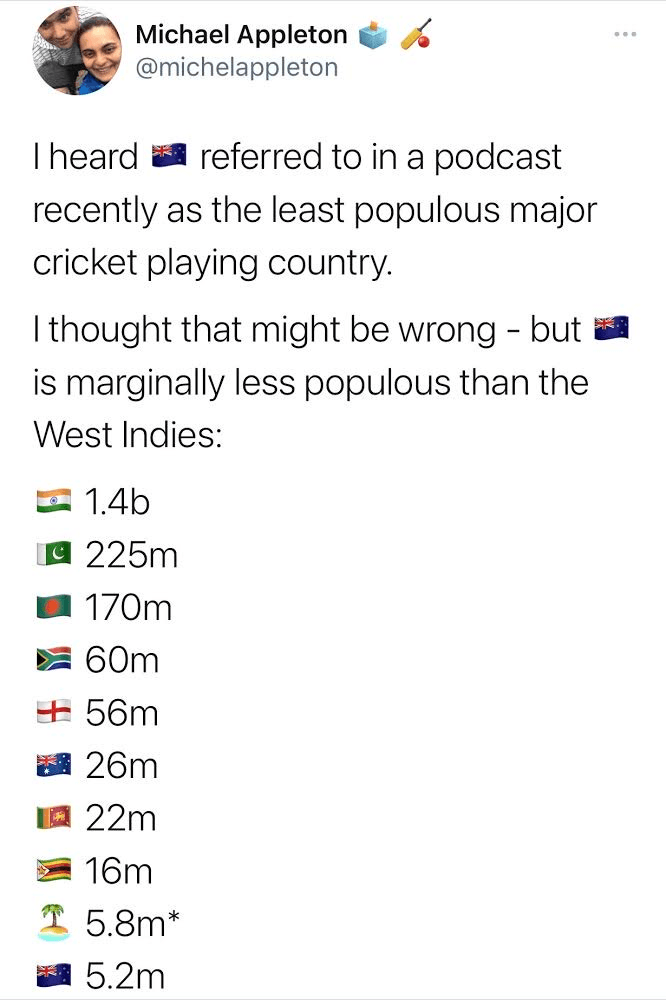 Of the nine teams that play test cricket frequently, only two are drawn from countries with populations under 10 million: New Zealand and the West Indies. The other seven range from Sri Lanka with 22 million to India with 1.4 billion.