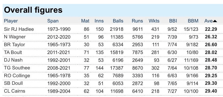Only nine bowlers have averaged less than 30, having taken 50 or more wickets. Three of them – Boult, Southee and Wagner – are in our current side.