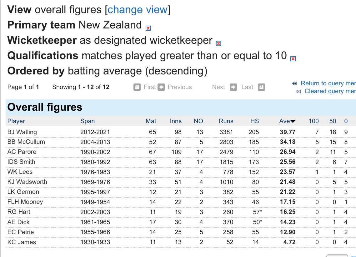 - Only one wicketkeeper, the current BJ Watling, has had a batting average of 35 or more. He averages almost 40.