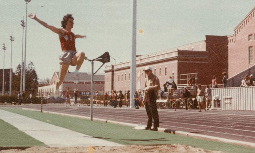 He first got the idea to try a somersault long jump in the winter of 1974. After returning from the Commonwealth Games in Christchurch, where he jumped “like a turkey” for a disappointing ninth, he started reading up on sports biomechanics.
