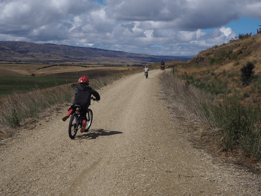 And it turns out that’s exactly how it worked. On our very first day, a sleety Southerly rain started lashing Ida Valley within 10 minutes of setting off and we realised to our horror that we hadn’t packed any gloves. Soon, everyone’s hands were numb with cold. The six-year-old started howling, which we tried to pacify with Pineapple Lumps dealt out at 200m intervals. But she continued howling so fiercely the lolly dropped from her mouth, which made her howl even louder. It was at that point we stuck her in the trailer, tied her little bike on top of it and… moved on.